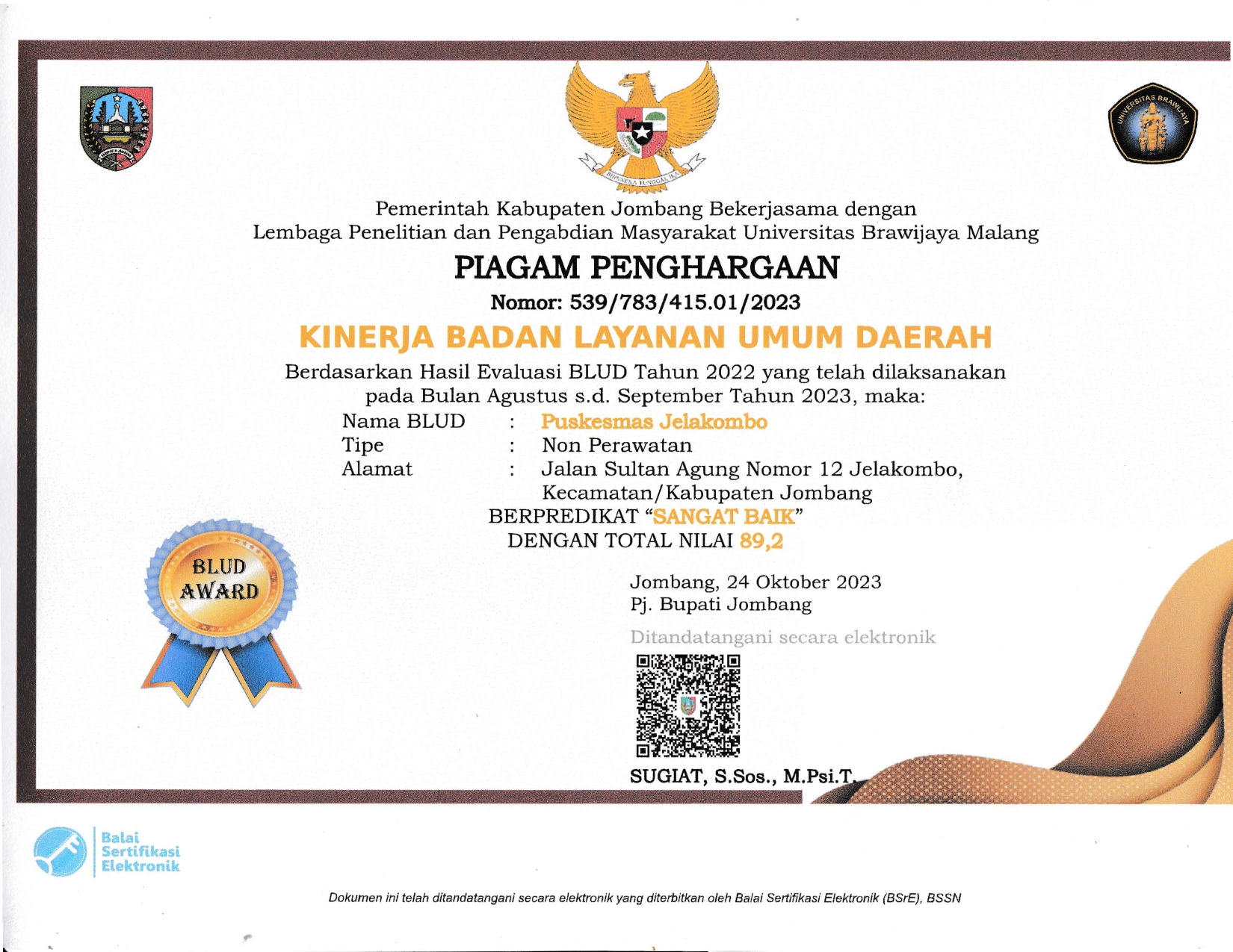 PIAGAM PENGHARGAAN BERPREDIKAT "SANGAT BAIK" DENGAN TOTAL NILAI 89,2